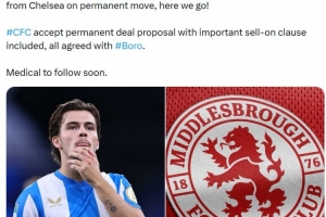 报道称切尔西接受了包含重要二次转会分成条款的永久转会提议,所有细节已与米德尔斯堡达成一致。球员的体检将在近期进行。