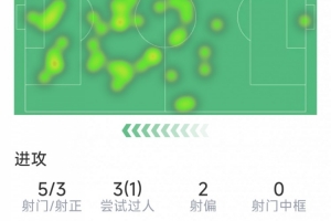 莱万本场数据:1粒进球,1粒乌龙球,5射3正,6次成功对抗
