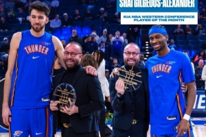 赛前,雷霆球星亚历山大领取了12月的月最佳奖杯,霍姆格伦则领取了12月月最佳防守球员奖杯。