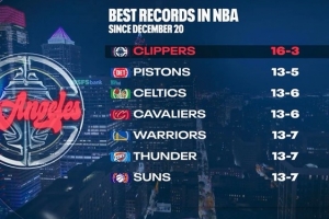 快船战胜爵士,转播方晒出12月20日(当地时间)以来联盟战绩前七的球队,快船高居第一:
