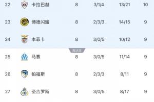 体育资讯01月29日讯 欧冠小组赛第7轮结束后,马赛9分、0净胜球排名第19位,本菲卡6分、-4净胜球排名第29位。