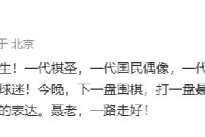 黄健翔写道:沉痛哀悼聂卫平先生!一代棋圣,一代国民偶像,一代大学生的围棋启蒙导师,一位真心狂热的中国球迷!今晚,下一盘围棋,打一盘聂老当年中日围棋擂台赛的棋谱,是我个人最好的表达。聂老,一路走好!